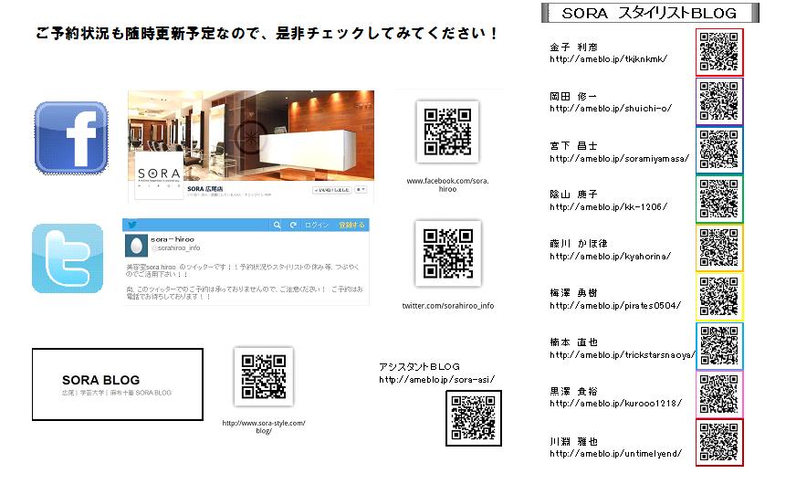 広尾店 BLOGまとめ 2013/02/07 MAIN SORA 広尾店 こんにちは! FCチーム大川です。 SORA広尾店の情報がSNSで見れます! 広尾店の Facebookページ、 Twitterアカウント、 各スタイリストのアメーバブログ これらのリンクをまとめてPOPとして店内に置きました。 QRコードで簡単に飛べるようになっています。 FacebookやTwitterで限定公開のキャンペーンなども考えていますので、 お友達申請やフォロー、お気軽にして下さいね!(^^)