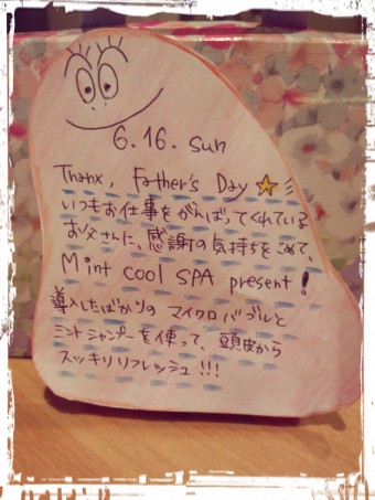 6.16☆Father's Day キャンペーン 2013/05/31 MAIN 麻布十番店 FCチームの山田です。 6月16日(日)は父の日です! そこで、SORAでは大好評のマイクロバブルを使ったキャンペーンを行います♪ 毛穴の汚れまですっきり落とすことのできるマイクロバブルと 夏に大人気のミントベルシャンプーを使った Mint Cool SPAを6月16日限定で実施します♪ お父さんに日頃のありがとう、お疲れさまを☆ FCチーム 山田